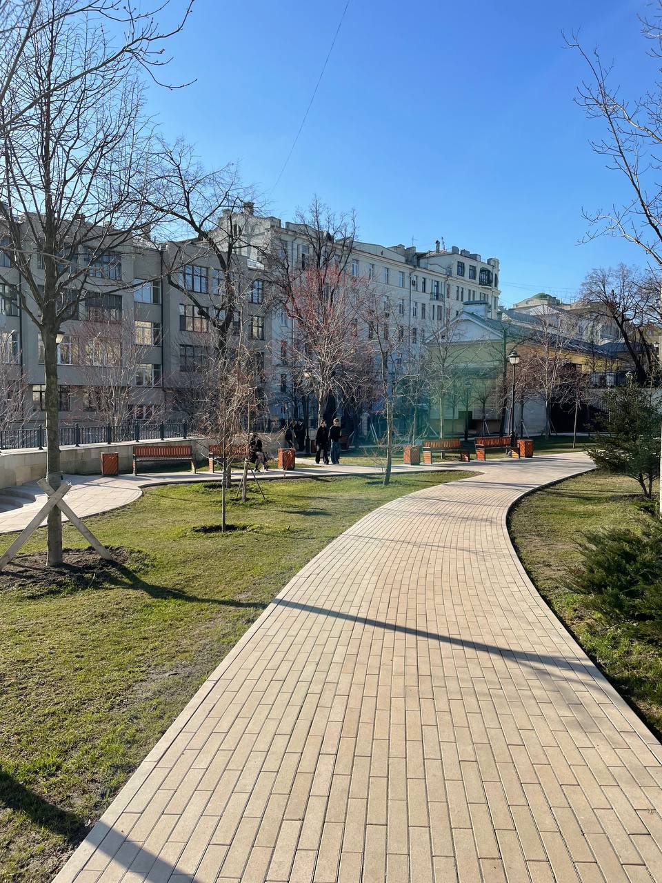 В мае тут очень красиво цветут декоративные яблони бордовыми соцветиями.