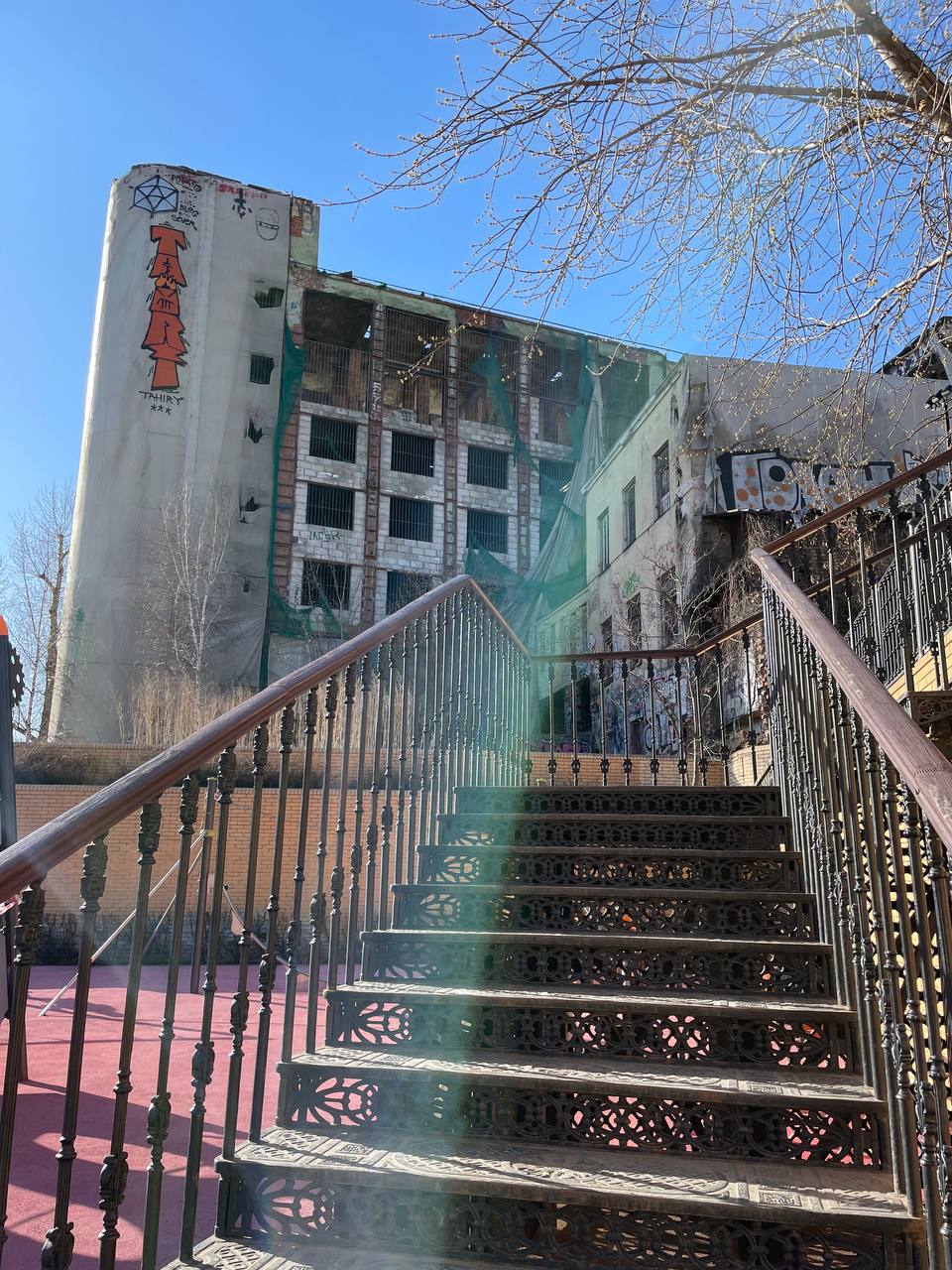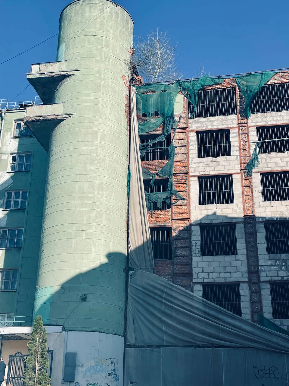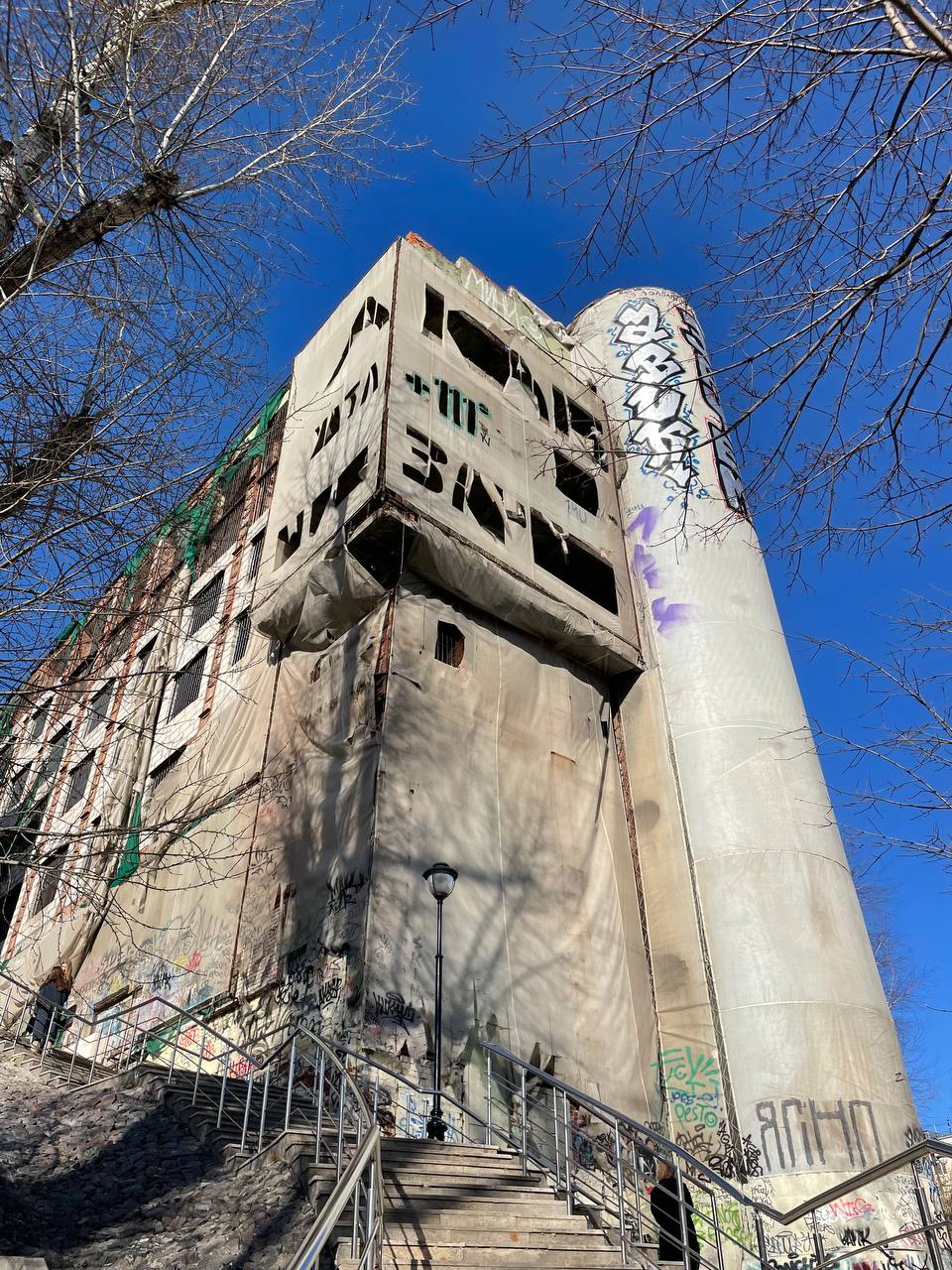 На горке возвышается доминанта местности - модернистское здание бывшего общежития 1920ых годов с округлыми формами. Вплотную рядом прижалась заброшка другого общежития. Оба вместе смотрятся как огромный впечатляющий арт объект. Спешите сфотографироваться на фоне. Уверена, будет реконструкция.