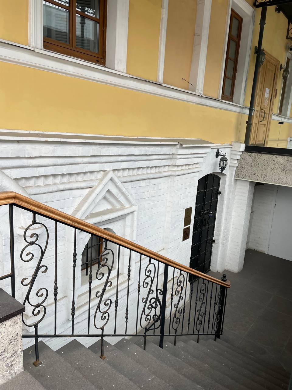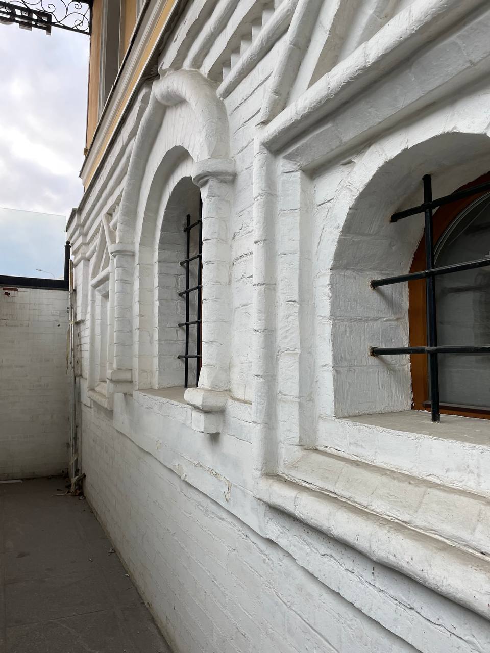 Цокольный этаж – палаты XVI века, бережно восстановили. Мы видим уходящие вниз белые стены с узорчатыми наличниками