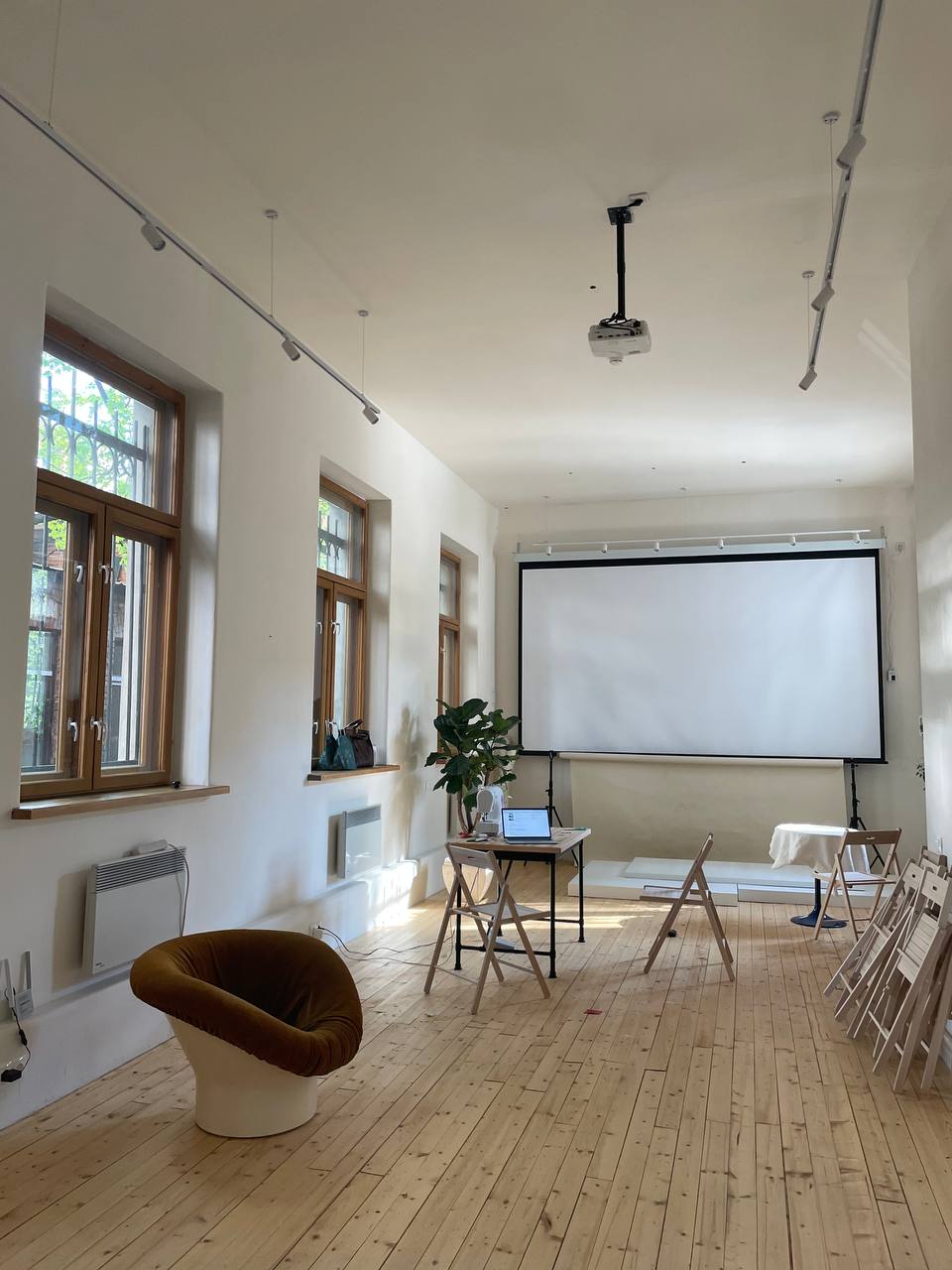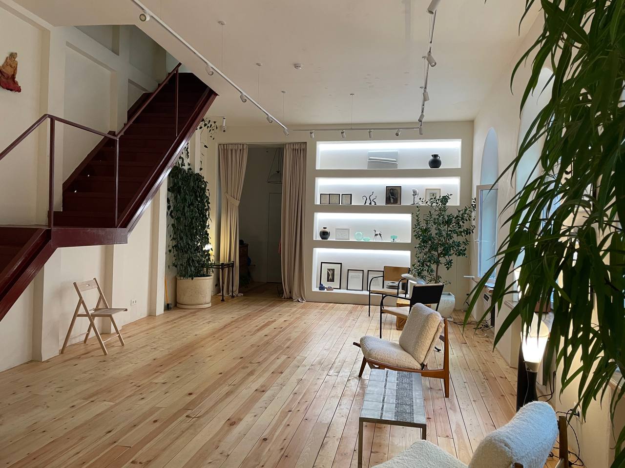 Место удивительное и атмосферное, прямо напротив дом Бурганова. Интерьер: деревянные полы, крашенные светлые стены со смягченными углами, акцентная лестница бордового цвета. Как говорят сами галеристы вино с молоком.
