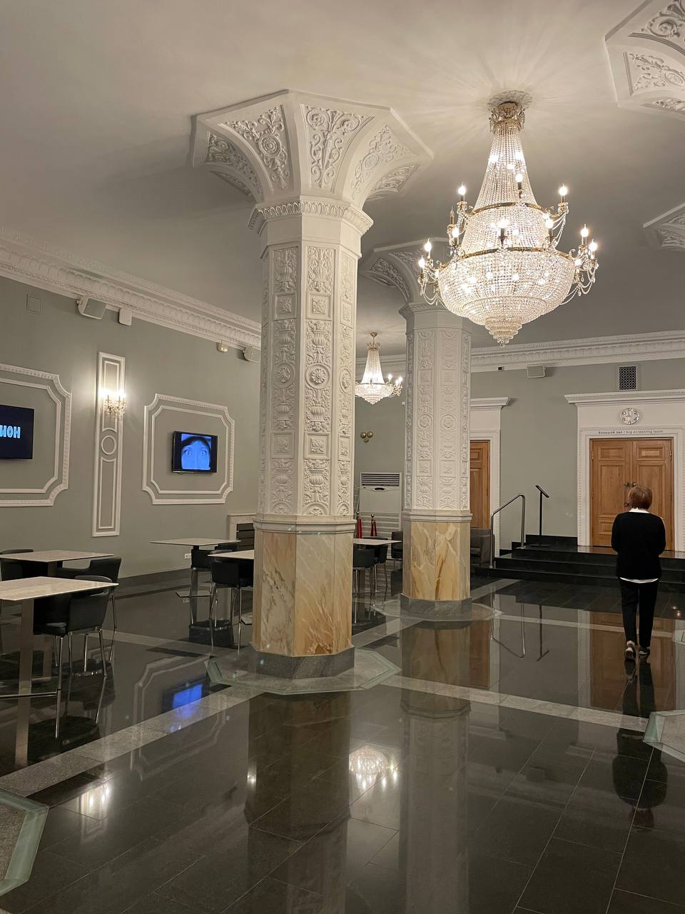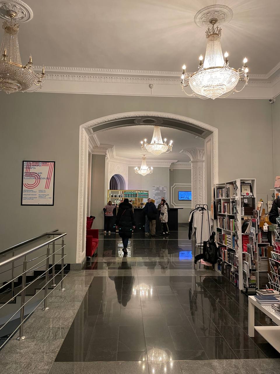 Кроме того тут конечно можно посмотреть новое кино или просто посидеть в уютном кафе на красных велюровых креслах в круто восстановленном интерьере