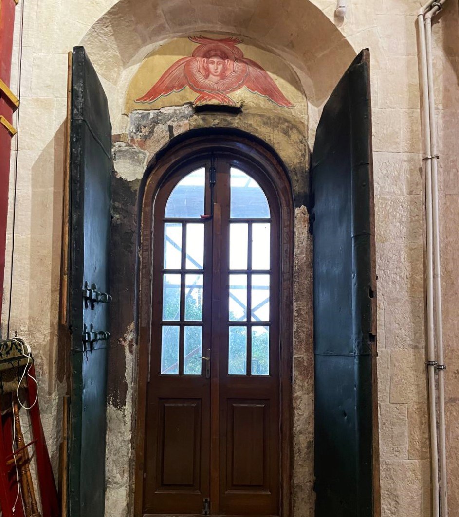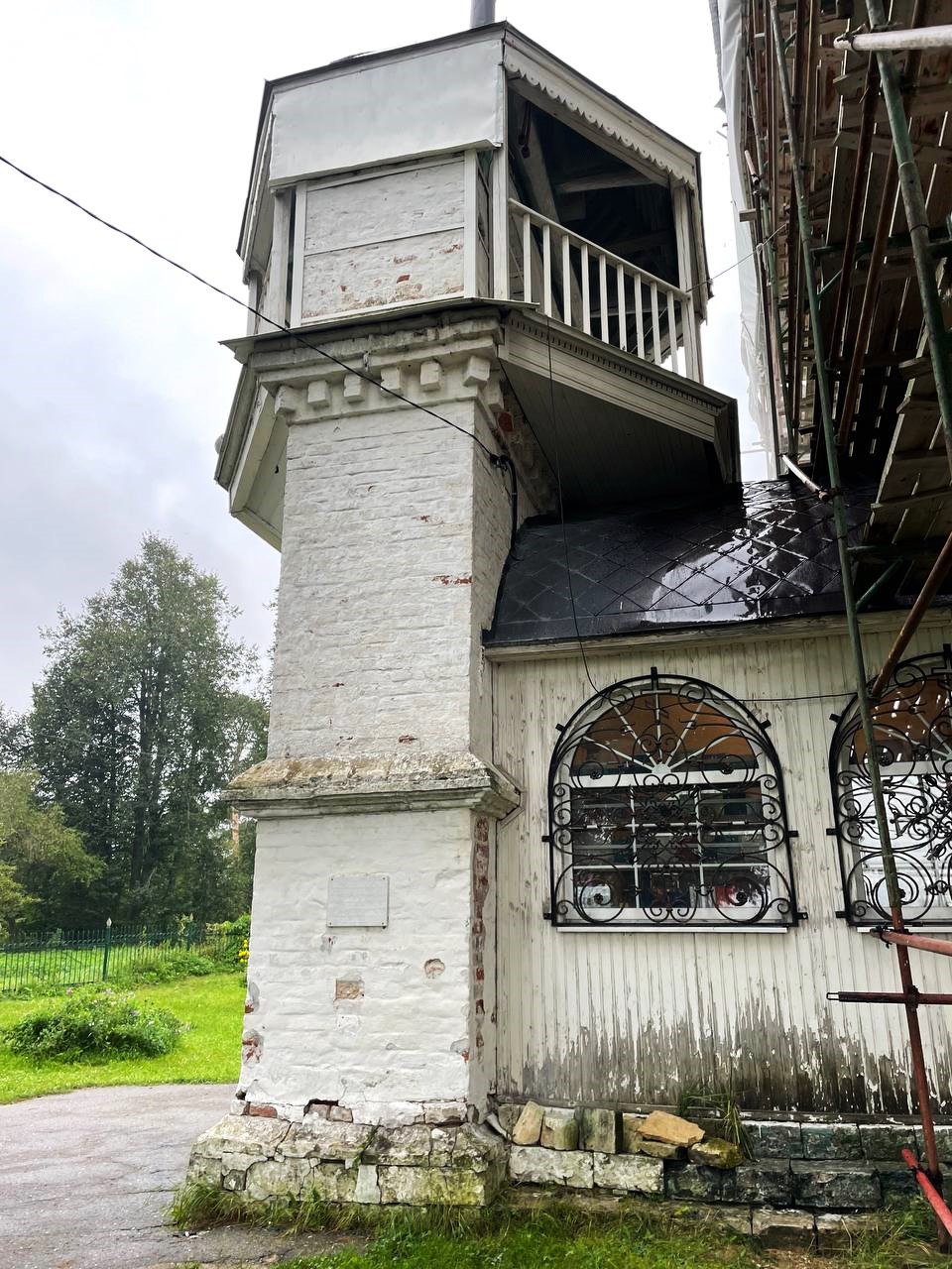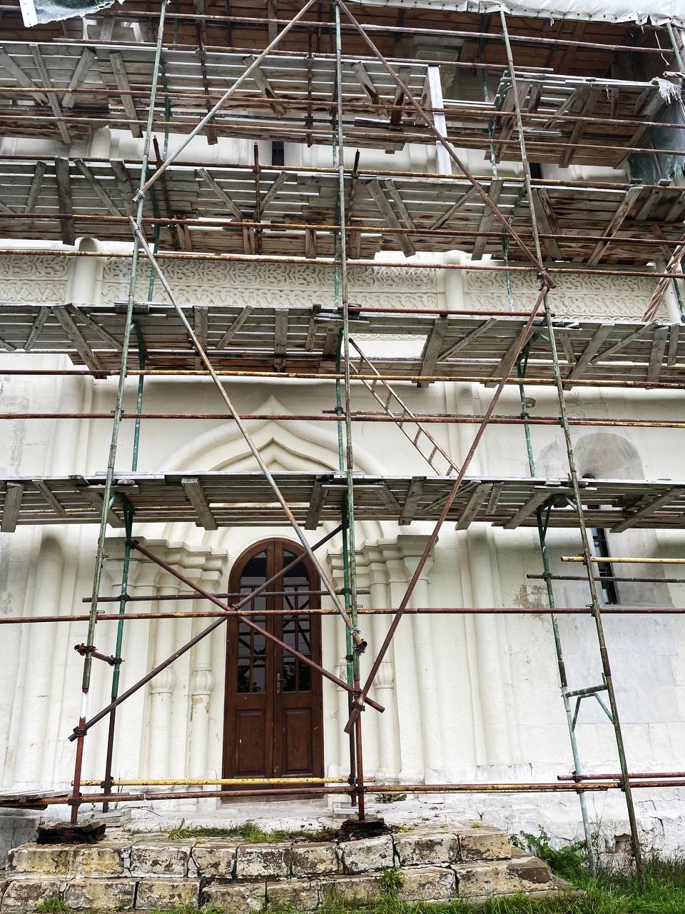 Эта жемчужина Звенигорода сейчас вся в лесах. Идет реставрация. Очищают белокаменные стены.