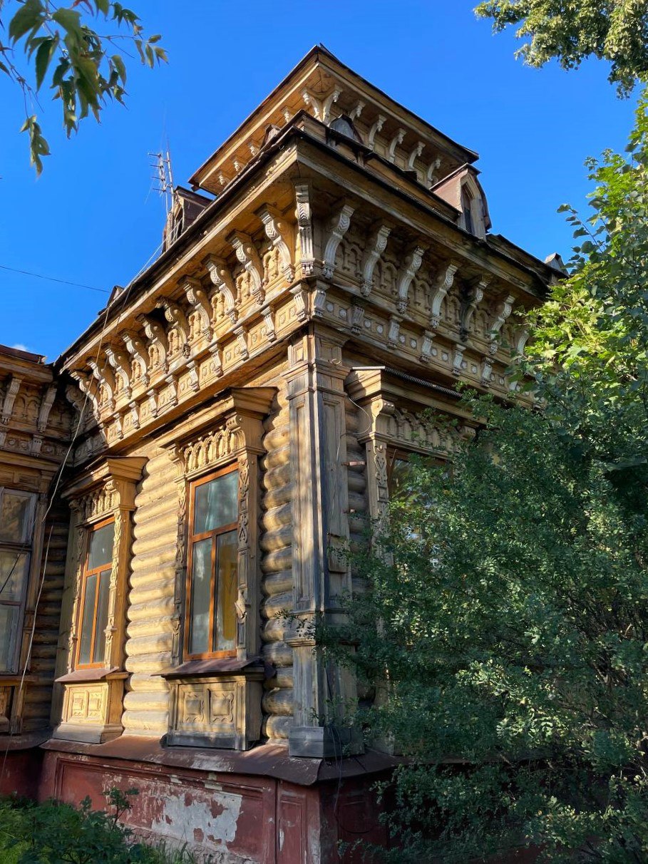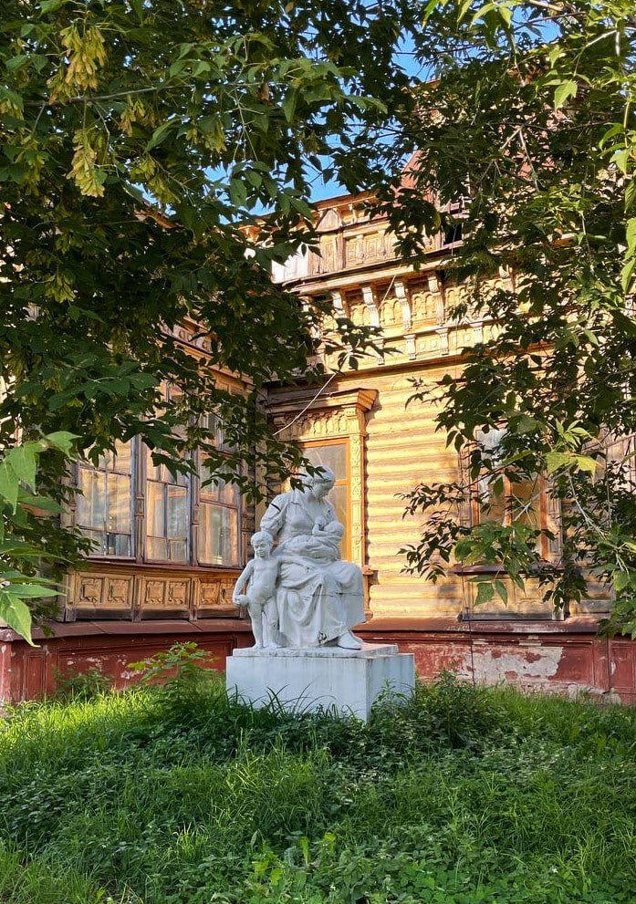 Рядом с фабрикой пряничное здание фабричной конторы и деревянный резной дом особняк фабриканта Соколикова, который был когда то роддомом, поэтому во дворе милая скульптура кормящей женщины. Домам требуется реставрация, здания еле дышат. Между этими красавцами деревянный дом с магазином тканей от фабрики, без вывески, захочешь не найдешь. Я чудом узнала заранее, когда готовилась к поездке. Фабрика перешла на гобелены, парчу и шелк. Продавщица одна, работает по своему графику. Может быть и закрыто. Ассортимент тканей мягко сказать остановился в развитии в том веке. Но можно еще что-то найти, например, гобелены по мотивам Морриса. И то они уже сняты с производства. Печально!