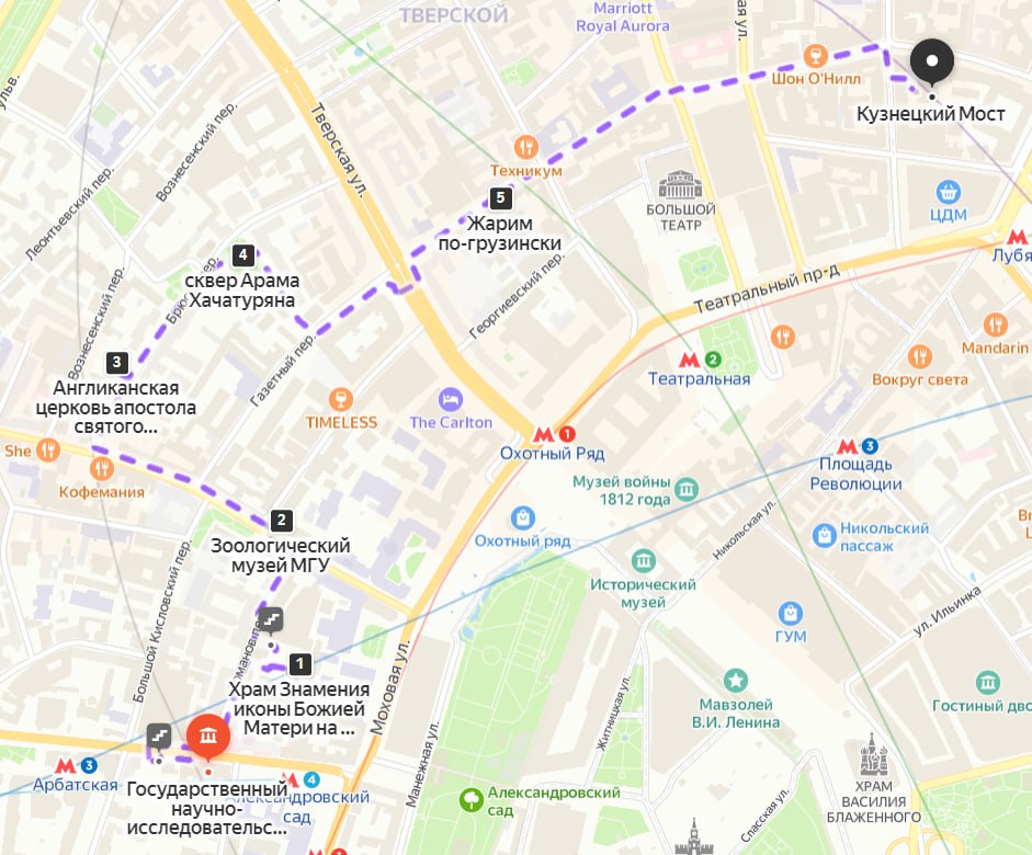 Я подготовила очередной маршрут от музея Щусева. Но потом нашла стрим в записи Александра Усольцева Большая Никитская – СТРИМ. (Гугл в помощь)