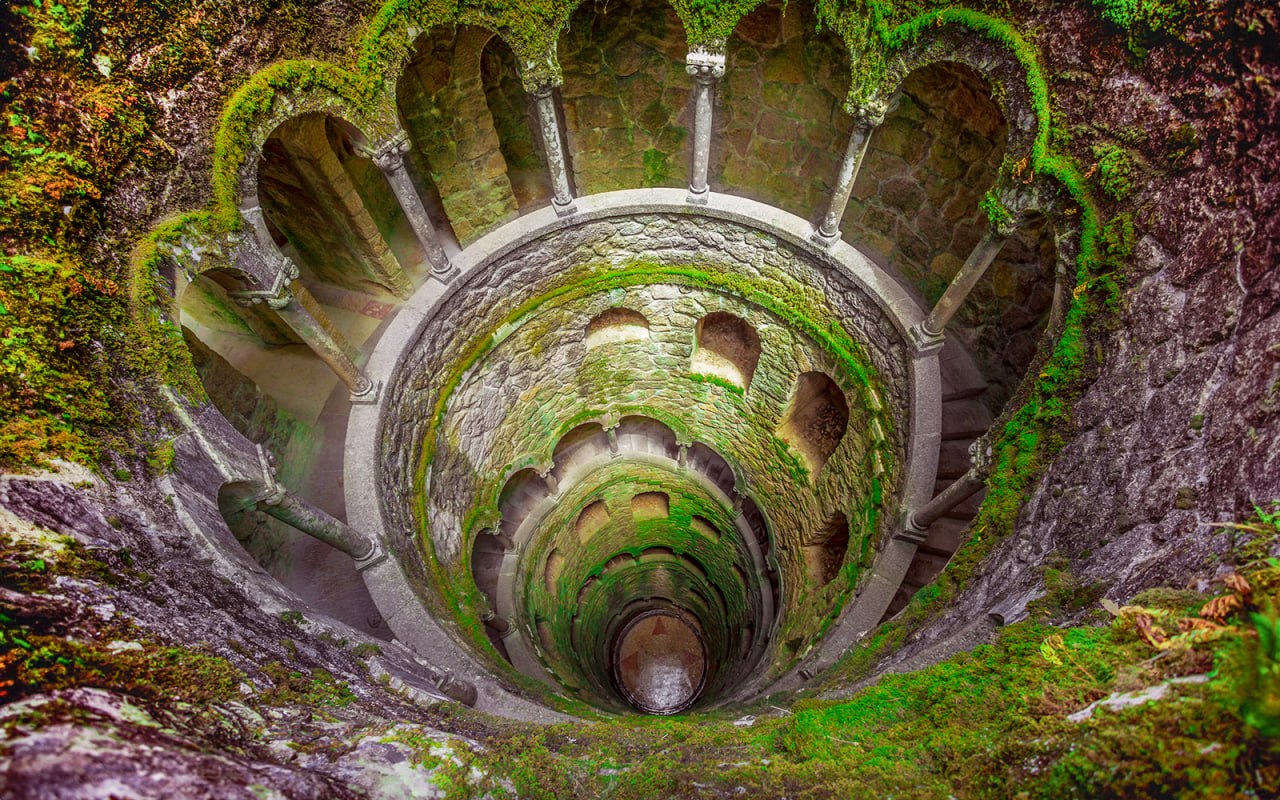КОЛОДЕЦ ИНИЦИАЦИИ (Poço Iniciático) — 27-метровая винтовая башня в Кинта-да-Регалейра, уходящая вниз, с девятью уровнями, символизирующими девять кругов Дантова ада или девять ступеней масонского посвящения . По дну колодца выложена розетка с крестом тамплиеров, а спиральная лестница ведёт к системе подземных тоннелей, гротов и озер, соединяющих разные части парка . Исследователи связывают архитектуру с увлечением владельца алхимией, рыцарством и эзотерикой — здесь каждый камень, кажется, несёт скрытый смысл.