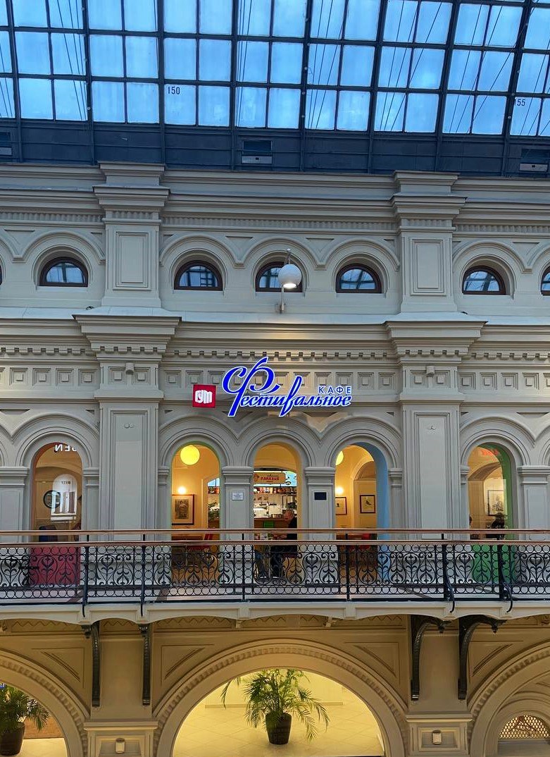 Идем в ГУМ. Забираемся повыше в кафе ФЕСТИВАЛЬНОЕ. Своим названием кафе обязано Молодежному фестивалю, который прошел в 1957 году и собрал в Москве студентов со всего мира.