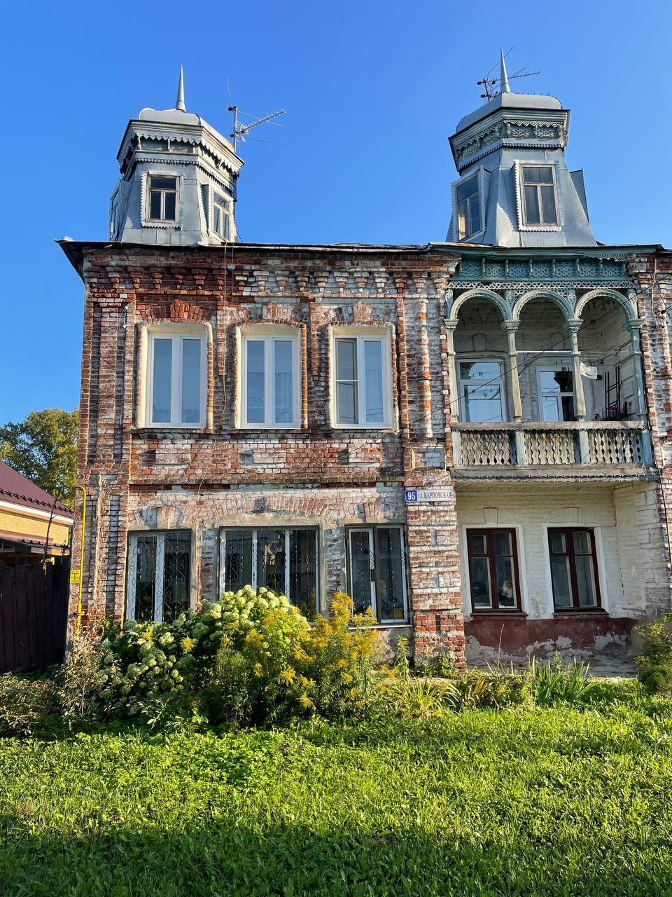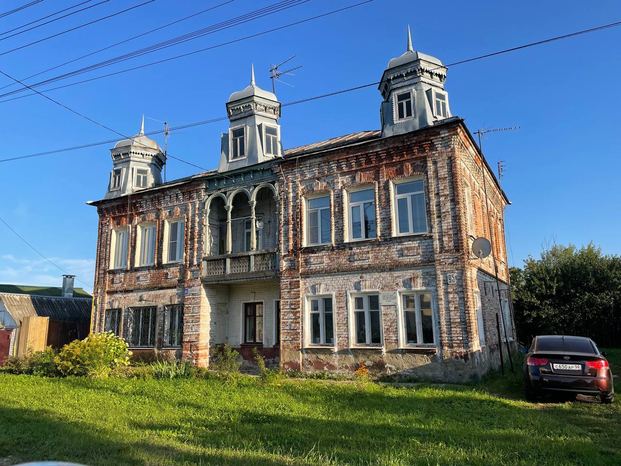 И в завершении мчим на окраину Павловского Посада, где находится необычный жилой дом с красивой верандой и тремя башнями на крыше. До революции особняк принадлежал местному фабриканту И.И. Сикачеву, владельцу химического завода