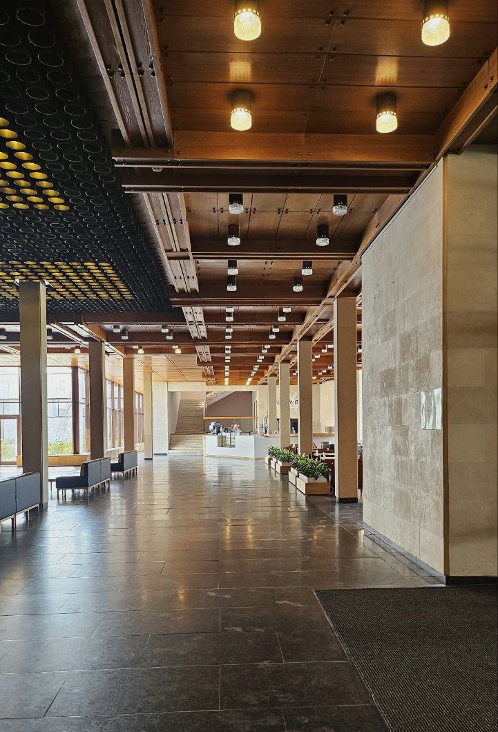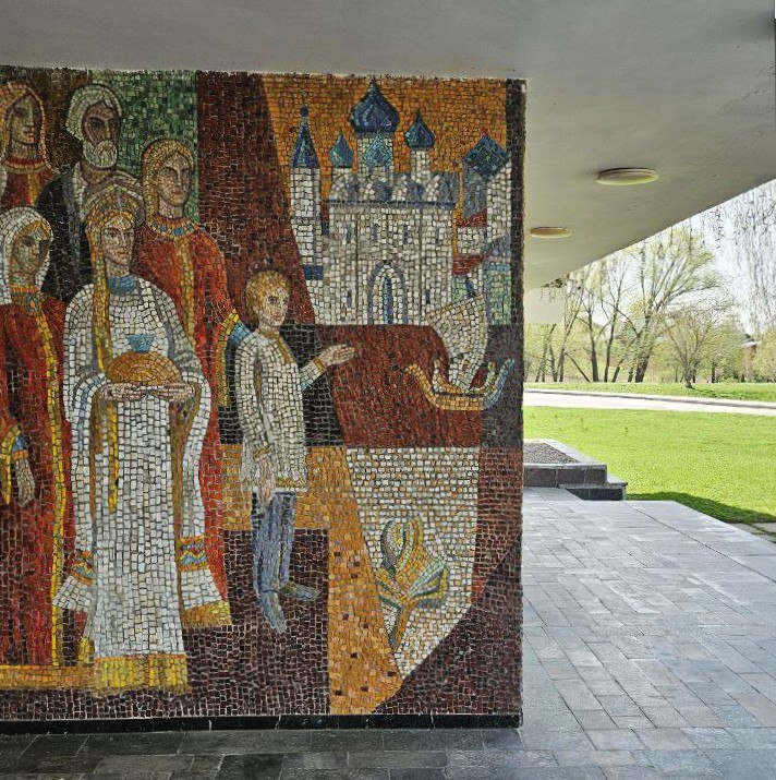 Гостиница построена в стиле советского модернизма. Мы видим и отделку камнем и стилизованные барильефы - отсылки к белокаменным храмам.