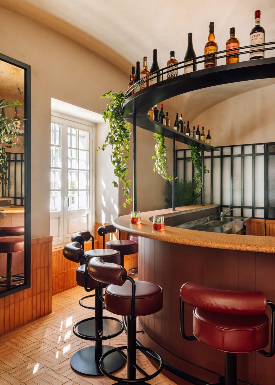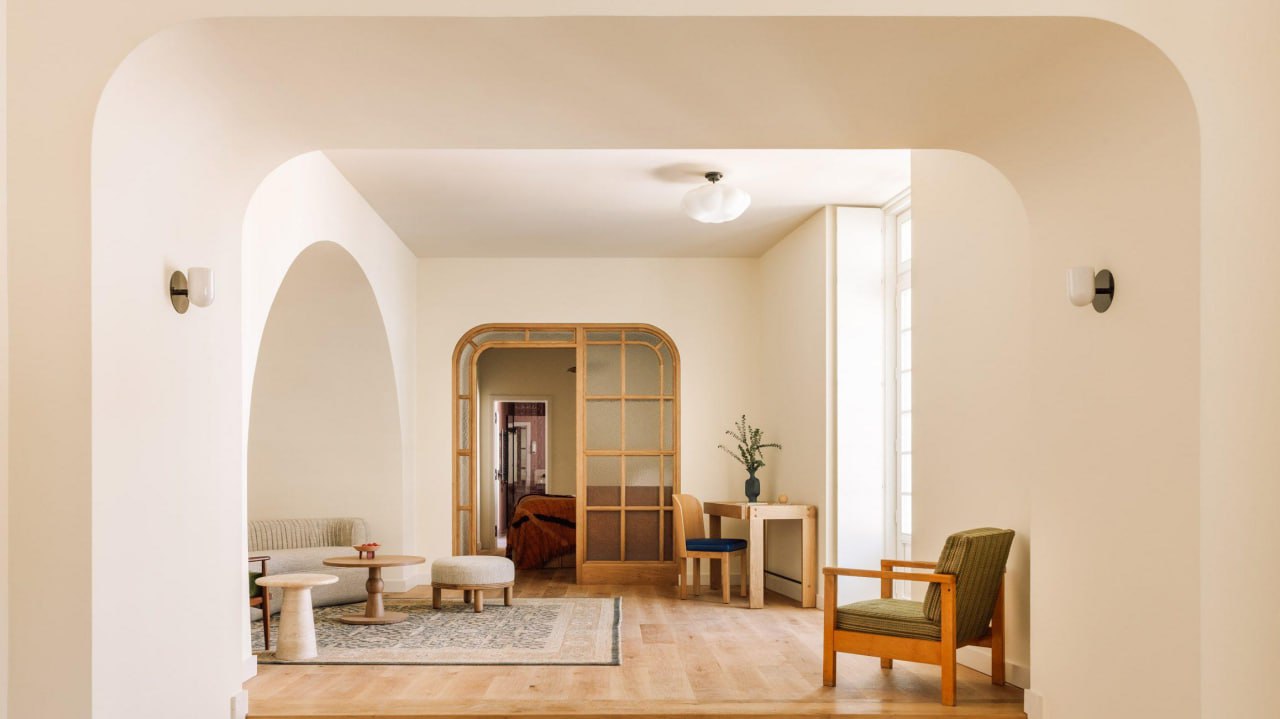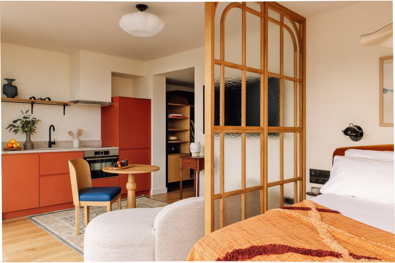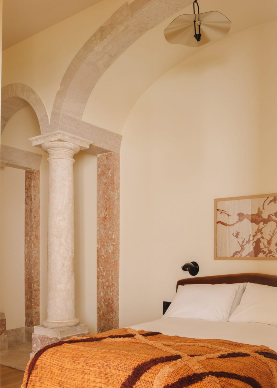Над проектом работали две команды. Нью-йоркская студия Post Company создала интерьеры номеров, которые бережно подчеркивают исторические детали: старинные арки, колонны и лепнину. Минимализм и природные оттенки здесь сочетаются с современной мебелью и декором от местных производителей. В каждом номере-люкс есть уютная гостиная и ярко-оранжевая мини-кухня, отделенная от спальни стеклоперегородкой, чтобы сохранить свет и ощущение простора.