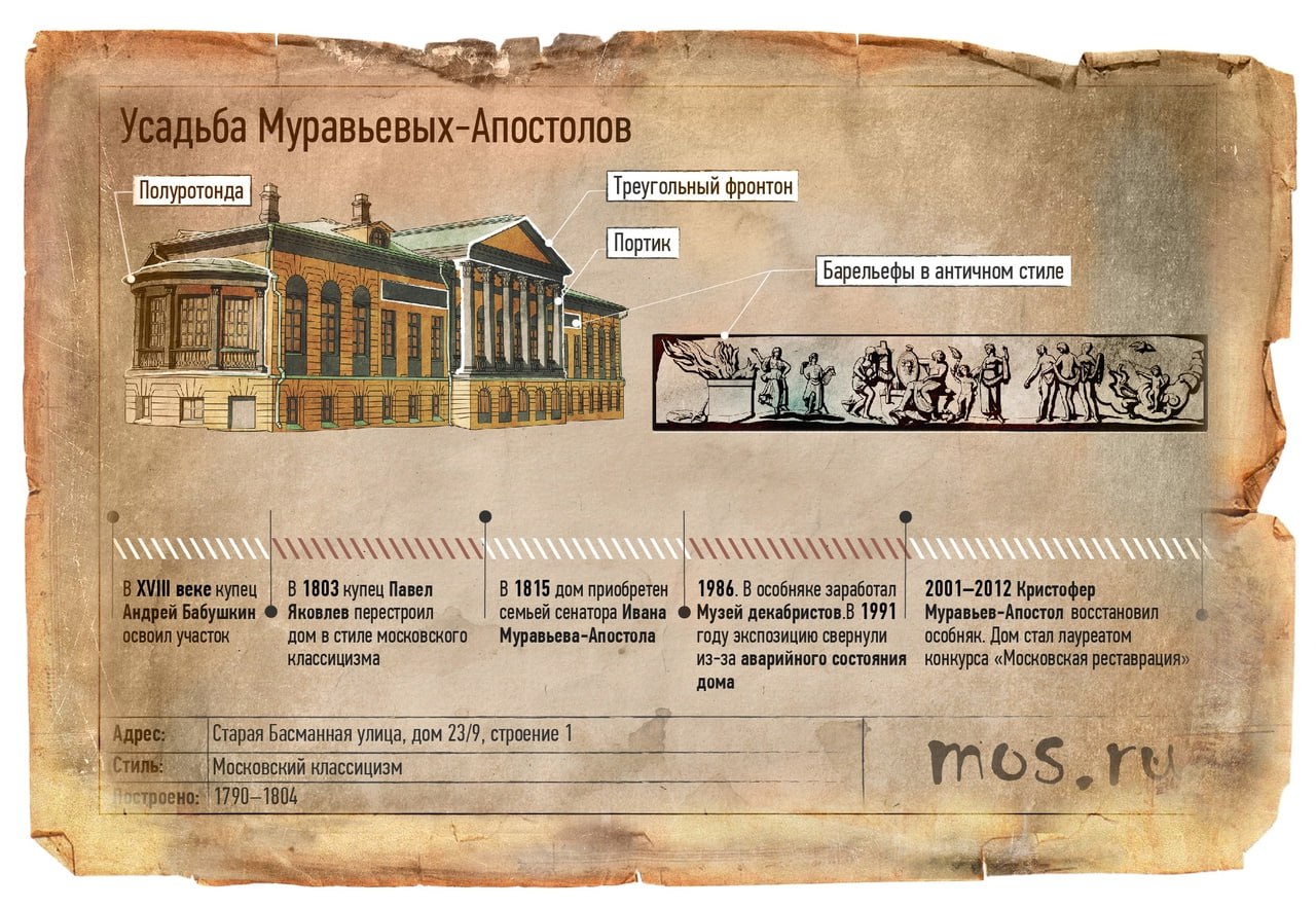 Это элегантное здание на Старой Басманной улице, известное как дом Муравьевых-Апостолов, имело разных владельцев. Построено в начале XIX века, пережило пожар 1812 года. В 1815 году здесь поселилась семья Ивана Матвеевича Муравьева-Апостола, известного писателя и сенатора. Трое его сыновей были декабристами. Позднее усадьбу продали, и она была использована как детский приют.