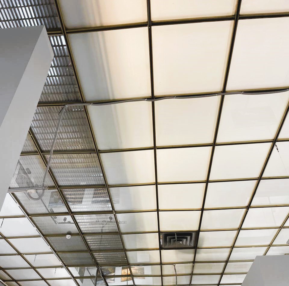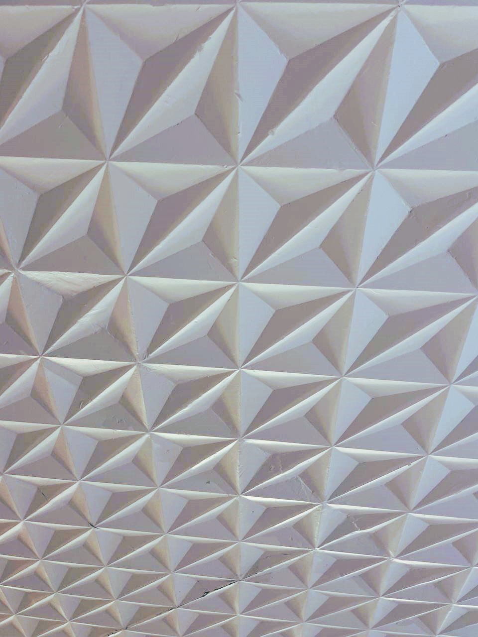 легкий светящийся потолок, 3d панели, ритмы перекладин и лестниц, гигантские люстры, камень из ракушечника.