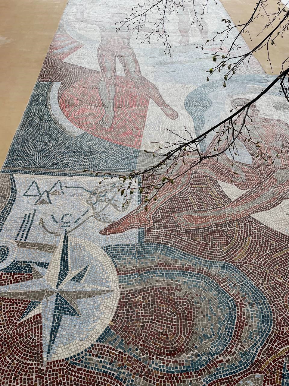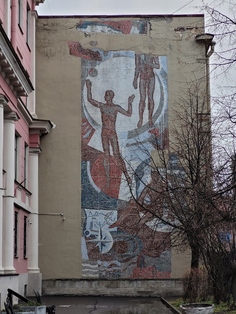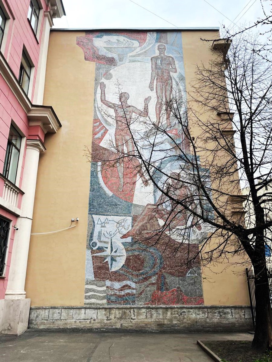А еще я мимо не пройду советской мозайки. Вот попалось панно «Спорт», украшающее брандмауэр Спортивной школы олимпийского резерва №1 в Ковенском переулке, дом 12, г. Санкт-Петербург. Оказалось, что ее хотели демонтировать, а в итоге даже восстановили.