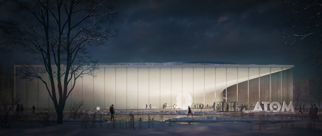 «Атомный» павильон станет уникальным с конструктивной точки зрения объектом. В нем будет четыре наземных и три подземных этажа с заглублением более 15 м и консоль вылетом длиной 53 м, покрывающая универсальное выставочное пространство, ограниченное стеклянным фасадом на всю высоту здания. Огромная стеклянная витрина, которой станет остекленный фасад двух сторон здания, будет демонстрировать выставки и инсталляции.