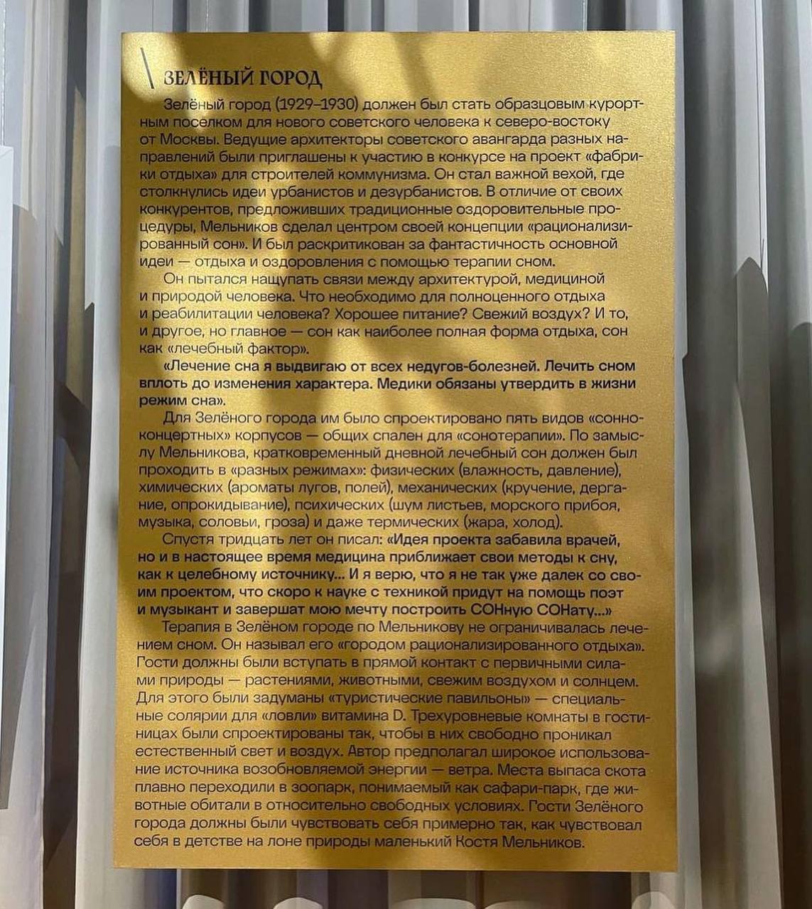 В 1929–1930 годах к конкурсу на планировку «Зеленого города» — города отдыха в Подмосковье — Мельников разработал проект «СОНная СОНата», предложив рационализировать отдых за счет качественно новой организации коллективного сна, включавшей правильный наклон пола в палатах, звуковое сопровождение, запахи, влажность и температуру. #MyLogicEvent
