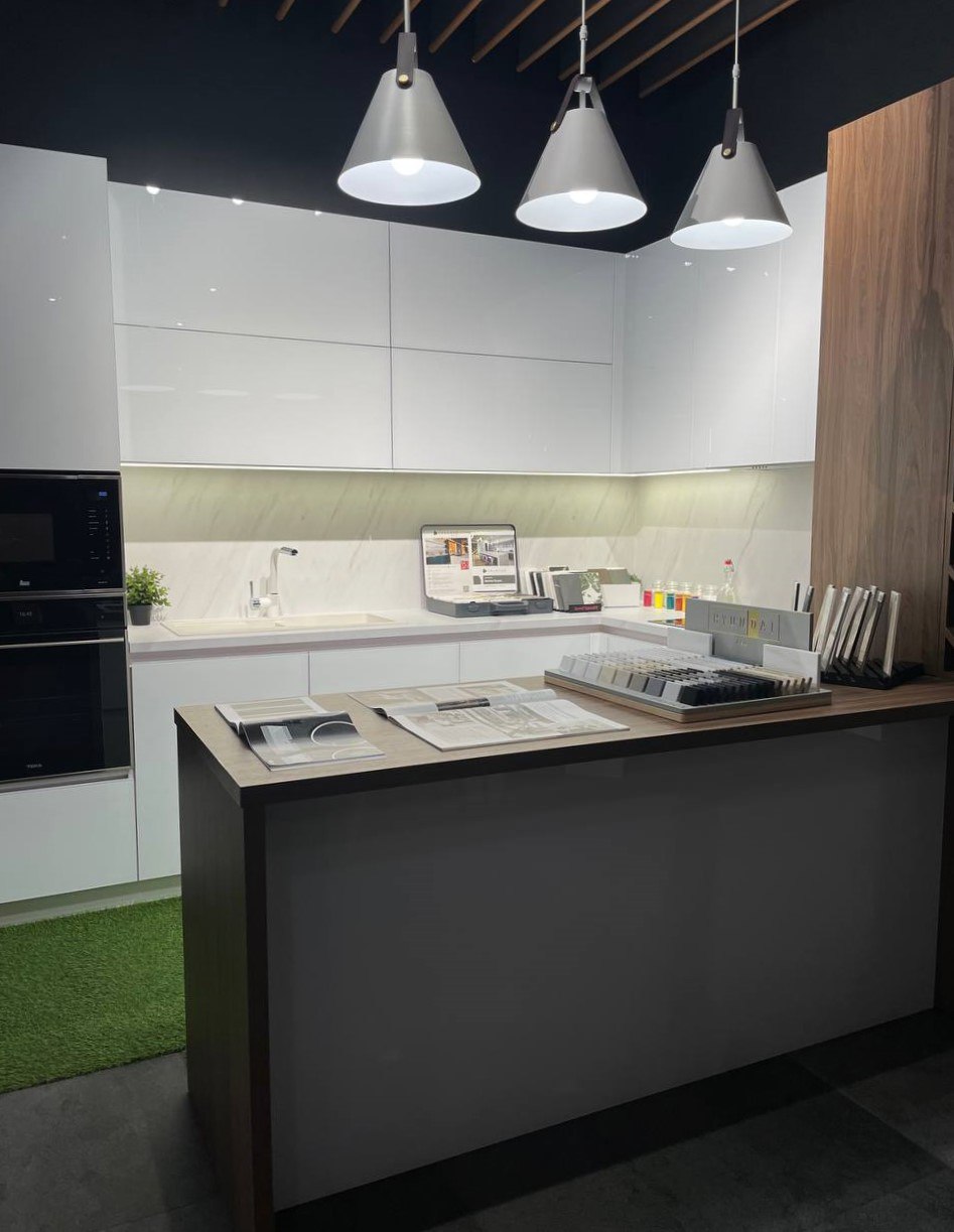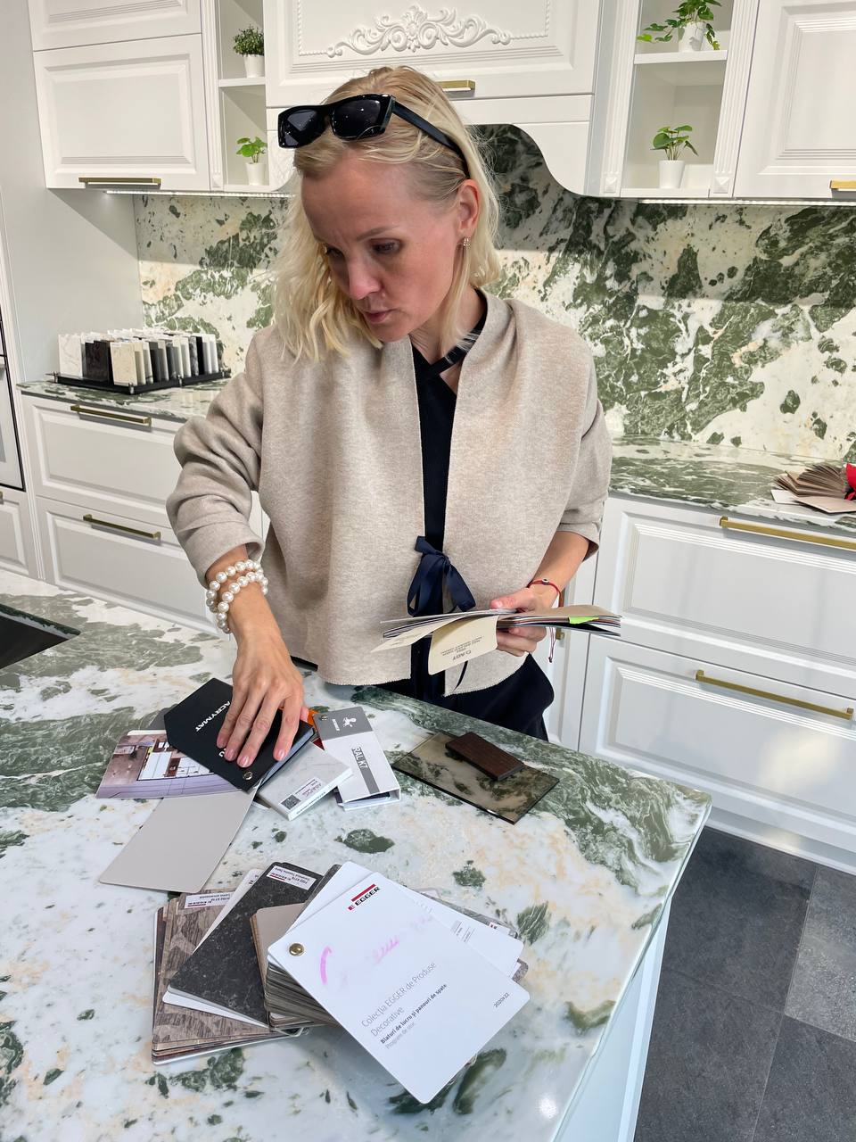 При заказе кухни необходимо подобрать много образцов: Цвет, фактуру и материал фасада, столешницы, рамок, стекла, раковины, смесителя. Все будет влиять на итоговый вид изделия. И кстати это моя любимая часть работы.